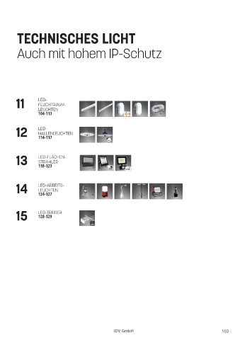 TECHNISCHES LICHT Auch mit hohem IP-Schutz 11 LED- FEUCHTRAUM- LEUCHTEN 104-113 12 LED- HALLENLEUCHTEN 114-117 DALI 13 LED-FLÄCHEN- STRAHLER 118-123 14 LED-ARBEITS- LEUCHTEN 124-127 15 LED-TREIBER 128-129 IDV GmbH 103