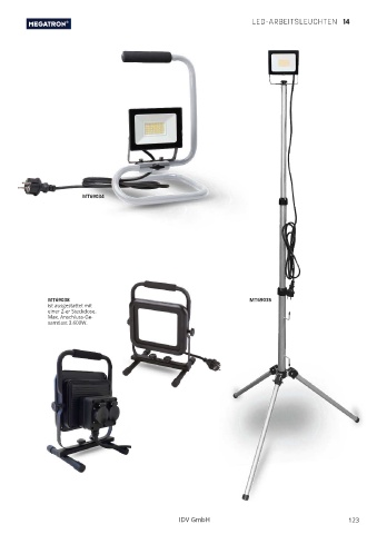 LED-ARBEITSLEUCHTEN 14 MT69034 MT69038 MT69035 ist ausgestattet mit einer 2-er Steckdose. Max. Anschluss-Ge- samtlast 3.600W. IDV GmbH 123