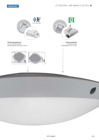 LED-DECKEN- UND WANDLEUCHTEN 16 0.5-3 meter/sec HF-Bewegungssensor Notstrom-Modul auch zur Nachrüstung zur Nachrüstung Erfassungsbereich siehe Schema: Leuchtdauer mind. 3 Std. 0.5-3 meter/sec 0.5-3 meter/sec • • IDV GmbH 133