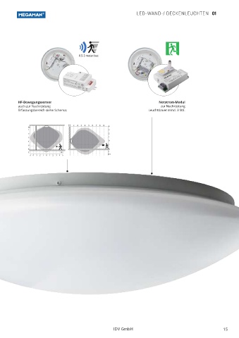 LED-WAND-/ DECKENLEUCHTEN 01 0.5-3 meter/sec HF-Bewegungssensor Notstrom-Modul auch zur Nachrüstung zur Nachrüstung Erfassungsbereich siehe Schema: Leuchtdauer mind. 3 Std. 0.5-3 meter/sec 0.5-3 meter/sec • • IDV GmbH 15