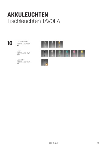 AKKULEUCHTEN Tischleuchten TAVOLA 10 LED-PREMIUM TISCHLEUCHTEN 99 LED- TISCHLEUCHTEN 100 LED-2-IN-1 TISCHLEUCHTEN 101 IDV GmbH 97