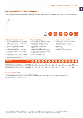 SubstiTUBE T8 EM Value 15 W/3000K 1200 mm 4058075611672 36 G13 1 212 15 1 620 108 3 000 190 ≥80 30 000 F 10 9,10 1 SubstiTUBE T8 EM Motion Sensor 13.1 W/4000K 1200 mm 4058075594326 36 G13 1 212 13,1 2 100 160 4 000 190 83 50 000 C 8 31,40 1